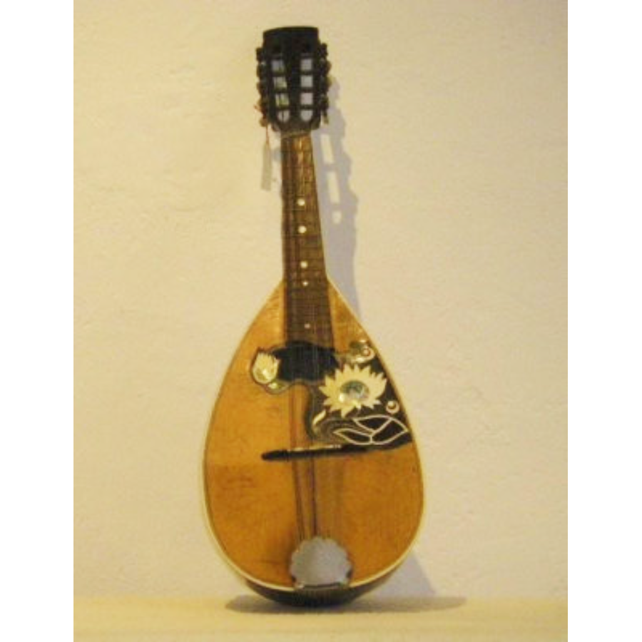 Die vier Doppelsaiten aus Metall sind wie bei einer Violine in Quinten gestimmt und werden mit einem Plektrum aus Schildpatt angerissen.