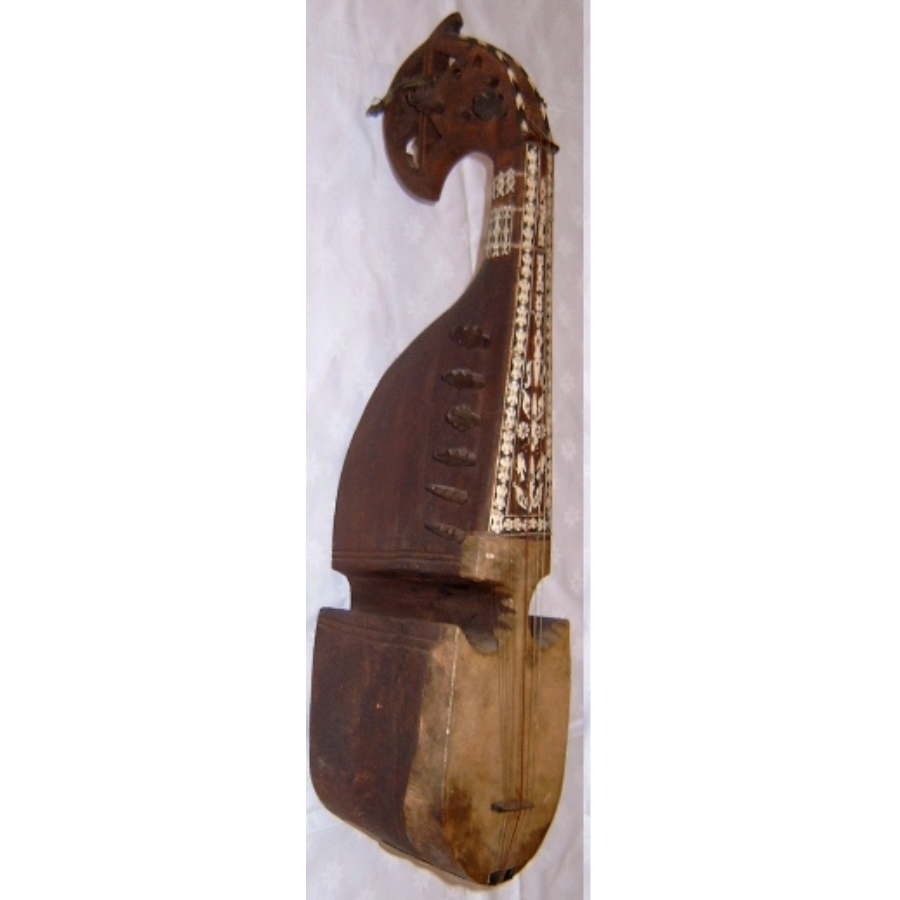 Das hier gezeigte Instrument hat 6 Spielsaiten und 6 Resonanzsaiten. Besonders schön sind die Perlmutteinlagen an Kopf und Hals.