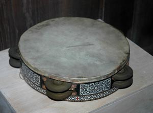 Unser Exemplar besteht aus einer Zarge aus Holz, die auf einer Seite mit einem Fell bespannt ist. Es hat innen und außen schöne braun-weiß-schwarze Intarsien. Im Unterschied zu einer Rahmentrommel hat die Zarge fünf Schlitze, in denen sich je zwei beckenförmige, paarweise locker angebrachte Metallscheiben befinden . Beim Schütteln und beim Schlagen auf Fell und Zarge (meist von Hand) entsteht ein helles, metallisches Klirren, das den trockenen Schlagton des Felles übertönt. Im Orchester ist auch das Spiel mehrerer abgestimmter Schellentrommeln üblich, die mit Schlegeln angeschlagen werden.