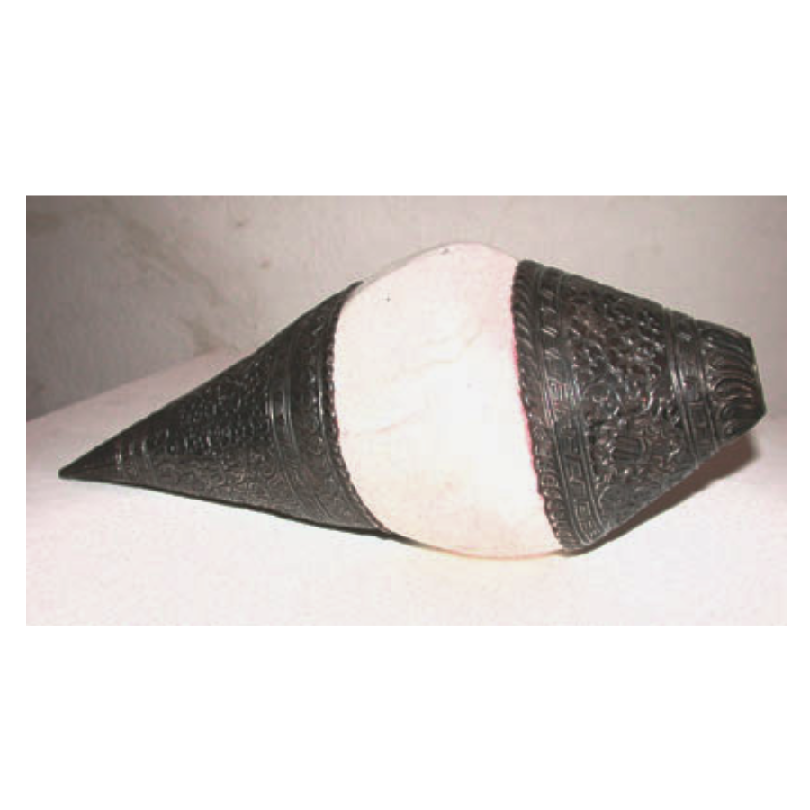 Die hier ausgestellte Schneckentrompete aus Tibet, Dung Kar genannt, stellt nun eine Ausnahme zu den bisherigen Vorstellungen von Trompeten dar. An Stelle einer Röhre wird hier ein Schneckengehäuse verwendet. Unter- und Oberende sind mit schönem, reliefdekoriertem Silberblech verkleidet. Im Oberende befindet sich das trichterförmige Mundloch. Diese Trompeten wurden in den Klöstern verwendet. Im Freien wurden sie paarweise zu kultischen Zwecken nach den vier Himmelsrichtungen geblasen.